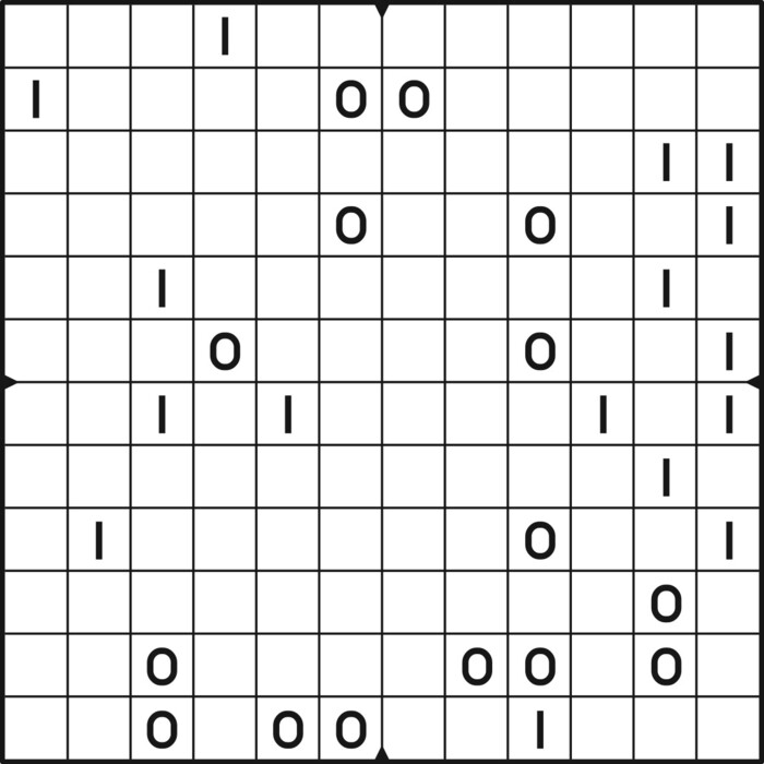 Every Sunday solve a special edition binairo. Remember: Solve each puzzle with only 0's and 1's and no more than two the same numbers may be placed directly next to or below each other. Every row and every column must contain as many zeroes as ones. The combination of zeroes and ones in every row must be unique, as does the combination in each column.