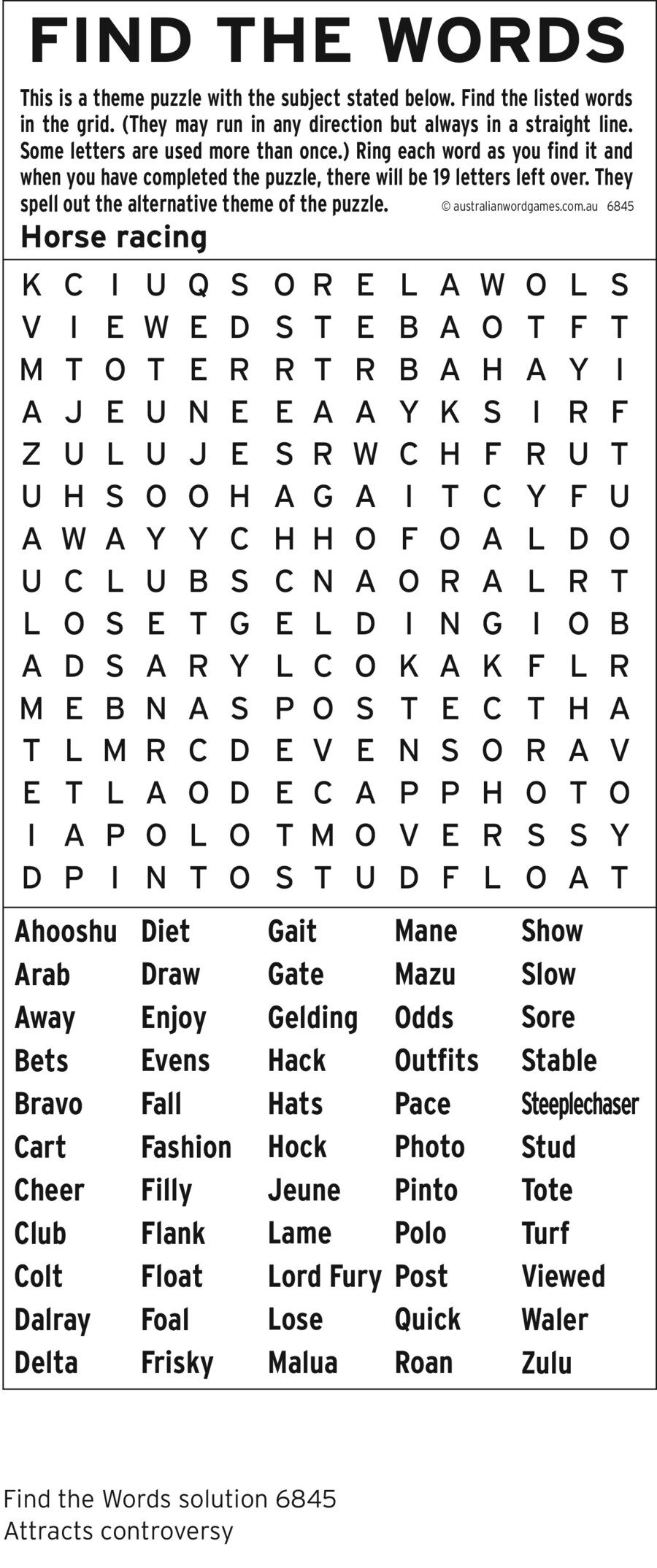 A daily wordfind with a new subject for each puzzle. Circle each word as you find it listed in the grid. Words may run in any direction, but will always be in a straight line. Keep in mind that one letter may be use multiple times.
