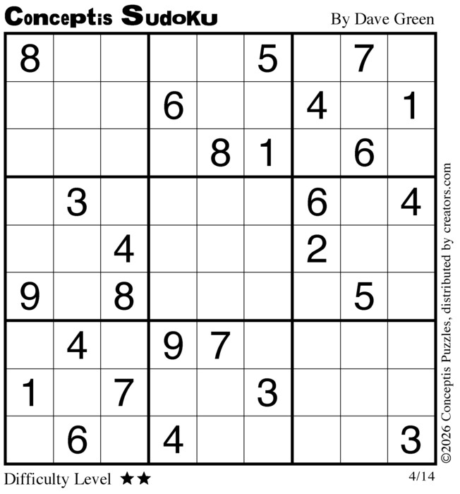 Each puzzle consists of a 9x9 grid containing given clues in various places. The object is to fill all empty squares so that the numbers 1 to 9 appear exactly once in each row, column and 3x3 box.